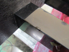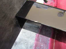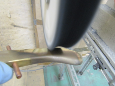 実をいうと、私はこの研磨作業が大好きです! 磨いた金属がピカピカに光っていく様子はこの作業ならではの爽快感があり、とても気持ちが良いです。 次に、柱部分の作業に進みます。 塗装面には少し深い傷がありました。 このキズの修復は、まずキズ周りを含め整形し、補修剤が馴染みやすいように整えます。