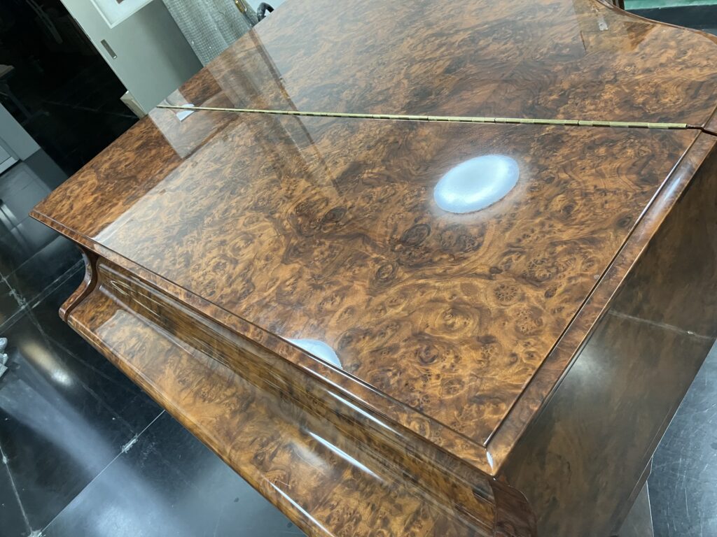 化粧板の不具合を含め、外装の整備はようやくゴールが近付いてきました。このような希少なピアノは、修復する私たちにも高い判断力と技術力が求められると思っています。オリジナルの繊細な木目・風合い・質感を保ちつつ輝かせる事を最優先に、昨年末から年を越して急がず丁寧に進めております。この魅力的なピアノが三木楽器開成館でお披露目される日を楽しみに、もう一息頑張って向き合ってまいります。