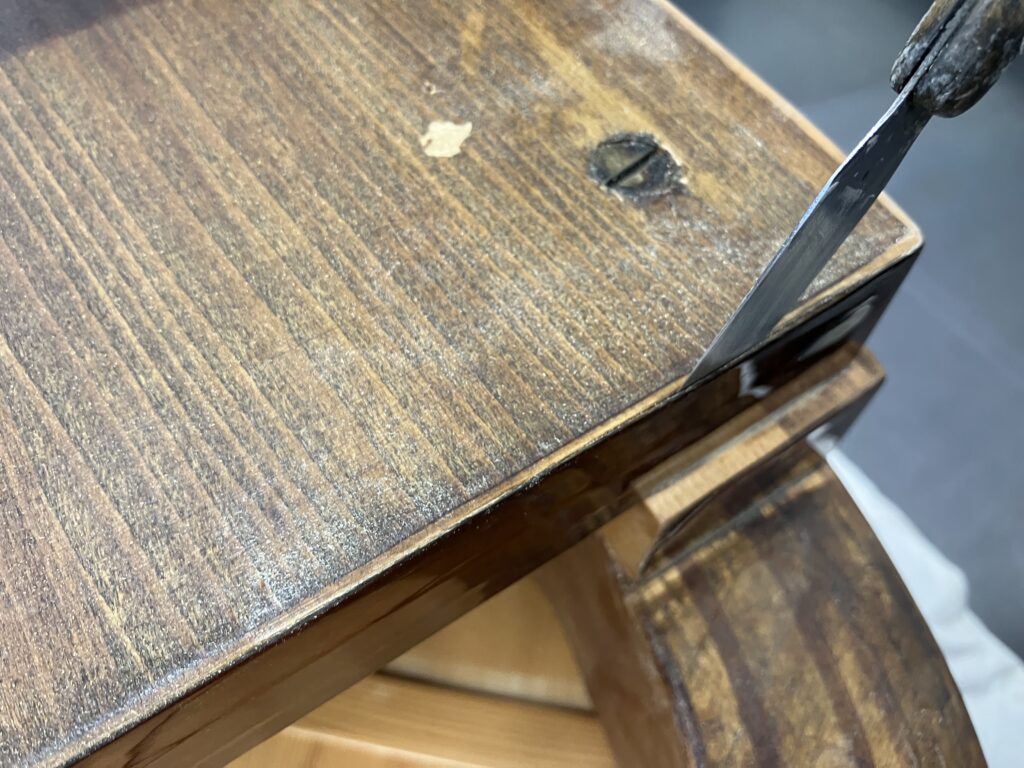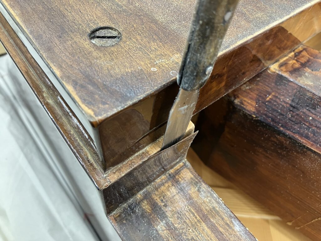 化粧板の浮きと剥がれの症状が見られたのはペダル柱・脚柱・ピアノの裏側、そして「前框(まえかまち)」と「棚板(たないた)」と呼ばれるピアノを弾く際に、演奏者が向かい合う部分です。鍵盤部を挟むようにある上下の板なのですが‥この部分の化粧板が下側から少し剥がれていました。通常のピアノでは、このような場合、化粧板を貼り替える事もありますが、この希少モデルでは、唯一無二の美しい化粧板を貼り替えるなんて選択肢はありません。そこで、オリジナルの化粧板を生かし接着修復する方法を選びました。
