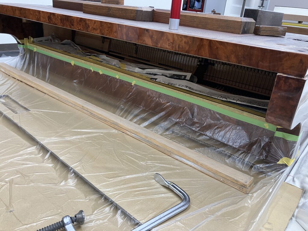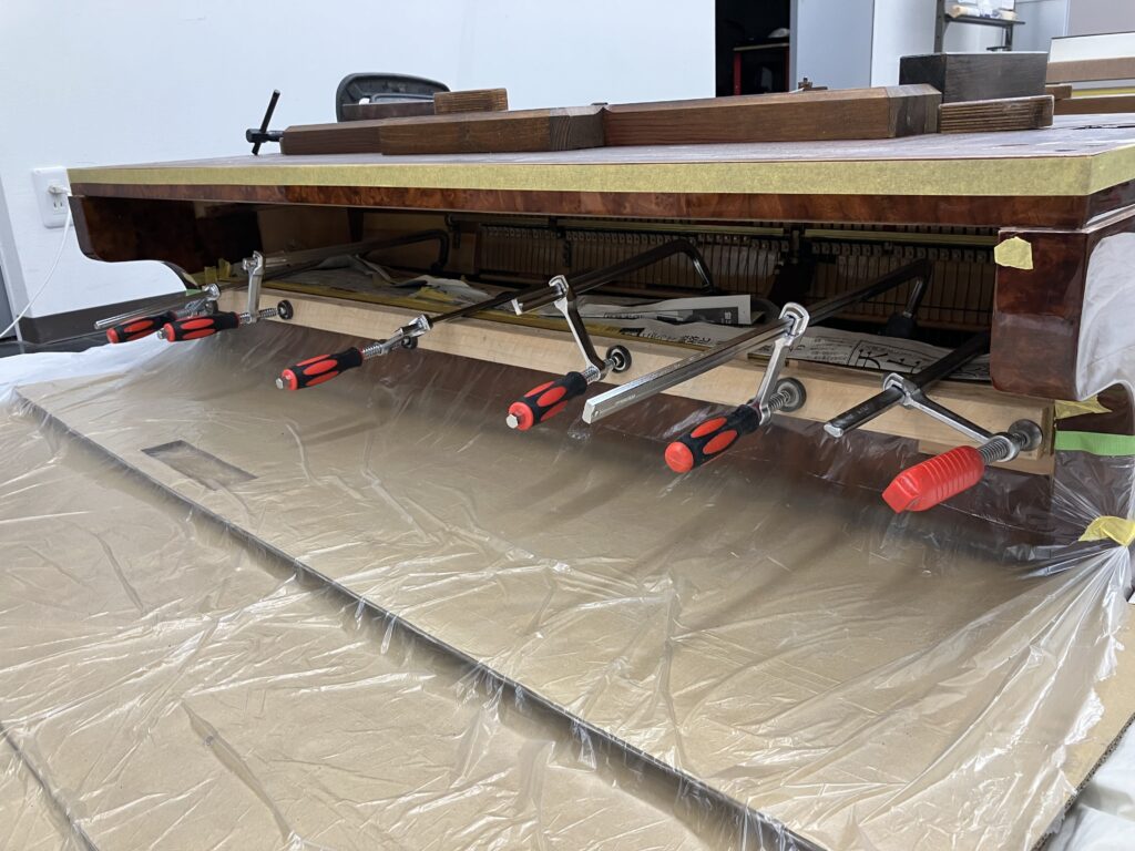 常に重量・重心を考慮しつつ、別のトラブルを招くことのないよう慎重に進めなければなりません。養生作業や接着剤を流し込むための下準備を含め、地面に這いつくばっての厳しい態勢。そんな動作が制限される作業は何かと苦労の連続でしたが、こうして裏返したおかげで、裏側のペダル取り付け部分・支柱・響板などの状態確認を通常よりじっくり行えるといった利点も!また剥離部分をしっかり確認でき接着剤の流し込みや万力での圧着もスムーズとなりました。結果としてオリジナルの化粧板を痛めることなく安定した接着が完了してホッとひと息です。