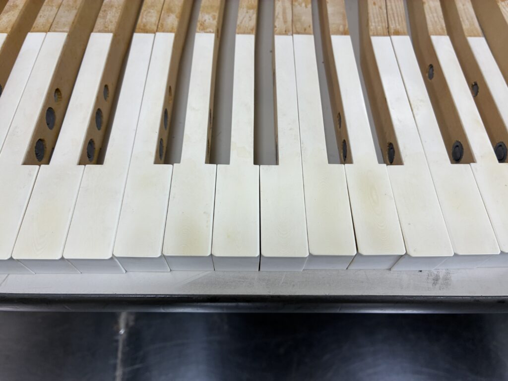 内部のチューニングピンや弦には多少の錆び・くすみはあるが問題なし!アクションも消耗が少なく良好!外装も目立った汚れや傷・金属パーツの錆びはほとんど見られず、状態は良好だと思われたのですが…複数箇所に化粧板の浮きや部分的な剥がれが確認されました。このような化粧板の剥がれはそれほど珍しいわけではなく、過去に整備したPLEYEL(プレイエル)・Orgast Holster(オーガストフォルスター)・PETROF(ペトロフ)などでも同様の症状がみられました。 また、白鍵には象牙が使われているのですが、象牙鍵盤特有の黄ばみが少々見られました。象牙(白鍵)漂白については、また改めてご紹介させていただこうと思っています!